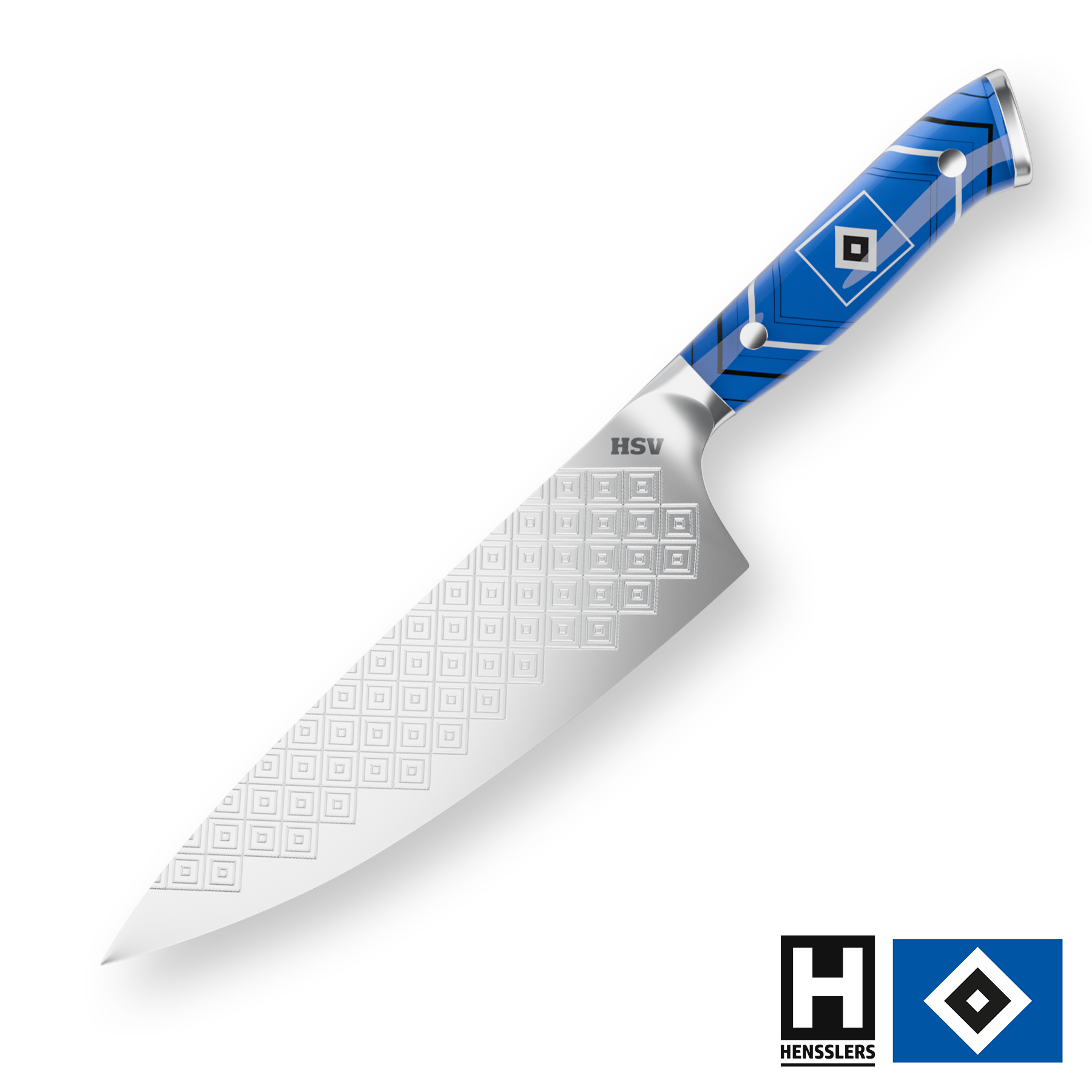 Die 20-cm Profi-Klinge aus Edelstahl wurde mit der ikonischen HSV-Rautenstruktur veredelt – ein Design, das nicht nur optisch glänzt, sondern bei jedem Schnitt an die Leidenschaft im Volksparkstadion erinnert.